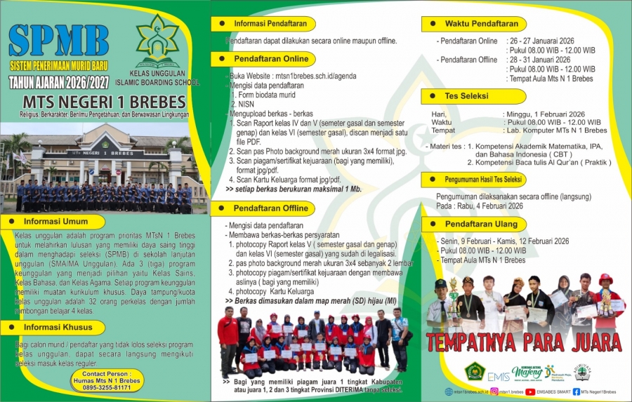 Sistem Penerimaan Murid Baru (SPMB) MTs N 1 Brebes Tahun Ajaran 2026/2027 MTs N 17 Januari 20260 Comments241 PembacaTanggalSenin, 26 Januari 2026Waktu8:00:00TempatMTs N 1 BrebesUntuk pendaftaran silahakan klik link dibawah :spmb.mtsn1brebes.sch.idBagikan : Next post KomentarForm KomentarAgenda Baru2601-2026Sistem Penerimaan Murid Baru (SPMB) MTs N 1 Brebes.. 8:00:000801-2026Penilaian Kinerja Kepala Madrasah (PKKM) Tahun 202.. 8:15:152804-2025UJIAN MADRASAH 22:03:451204-2025Pengembangan Potensi Siswa melalui kegiatan Pamera.. 8:14:000704-2025Halal Bihalal Madrasah 12:53:15SearchCategoryBerita13Info Beasiswa1Informasi3Karir0Pengumuman0Tips Belajar1Blog Terbaru 26 Januari 2026Sinergi Empat Mahasiswa PPL UNSIQ Wonosobo di MTsN 1 Br.. 26 Januari 2026SPMB (SISTEM PENERIMAAN MURID BARU) di Sekolah MTS N 1 .. 26 Januari 2026MTsN 1 Brebes Tampil Perkasa, Borong Medali Emas di Aja.. 26 Januari 2026Tim Futsal MTs Negeri 1 Brebes Raih Juara 2 AN Sportwea.. 20 Desember 2025HASIL SURVEY KEPUASAN MASYARAKATPopulerSiswa MTsN 1 Brebes Terima Beasiswa Kemenag Cerdas, Pre.. 02 Juni 2025Kembali Dibuka! Beasiswa Unggulan Kemdikbud untuk Mahas.. 19 November 2020Jurusan Sastra Indonesia: Materi Kuliah dan Peluang Ker.. 19 November 2020Tim Futsal MTs Negeri 1 Brebes Raih Juara 2 AN Sportwea.. 26 Januari 2026Sinergi Empat Mahasiswa PPL UNSIQ Wonosobo di MTsN 1 Br.. 26 Januari 2026DownloadPanduan sistem 177.49 KB 19344 DownloadTagsKSKKKEMENAGBREBES#HARIKARTINIKSKKTips#prstasiKegiatan siswaPENDIS